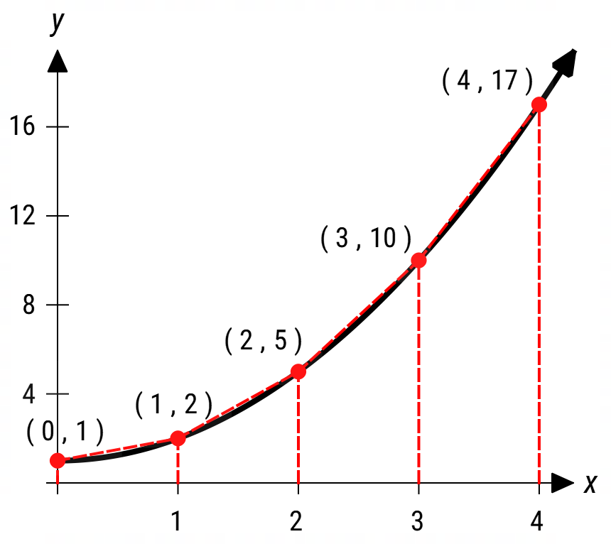 \( \text{Area} = \frac{1}{2}(1 + 2) + \frac{1}{2}(1 + 5) + \frac{1}{2}(5 + 10) + \frac{1}{2}(10 + 17) = 26 \)