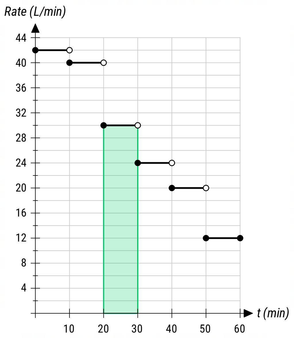 ✅ The shaded area = \( \style{font-size:10px} {300 \frac{\text{L}}{\min} \times 10 \min = 300 \text{L} \times 10 = 3000 \text{L}} \).